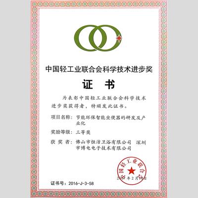 獎(jiǎng) 項(xiàng):中國(guó)輕工業(yè)聯(lián)合會(huì)科學(xué)技術(shù)進(jìn)步獎(jiǎng)(項(xiàng)目名稱(chēng):節(jié)能環(huán)保智能坐便器的研發(fā)及產(chǎn)業(yè)化)