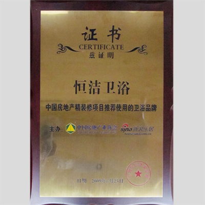 獎 項:中國房地產精裝修項目推薦使用的衛浴品牌