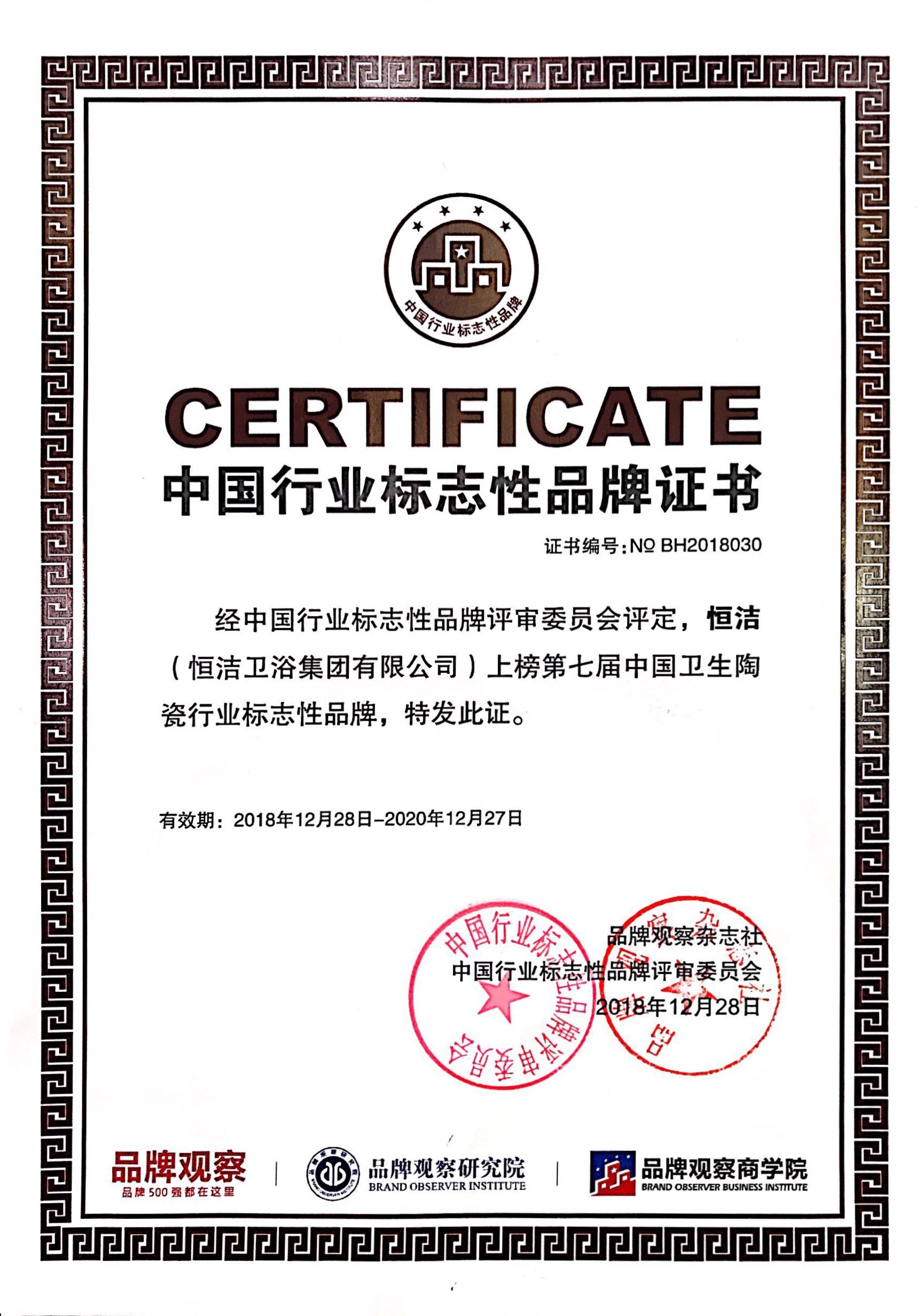 12月28日,由中國(guó)商業(yè)經(jīng)濟(jì)學(xué)會(huì)、全國(guó)品牌社團(tuán)聯(lián)席會(huì)、品牌觀察雜志社、品牌觀察研究院、品牌觀察商學(xué)院、北京國(guó)信品牌評(píng)價(jià)科學(xué)研究院聯(lián)合舉辦的第7屆中國(guó)行業(yè)標(biāo)志性品牌頒獎(jiǎng)儀式在福州舉行,恒潔榮膺行業(yè)唯一的「2018中國(guó)衛(wèi)生陶瓷行業(yè)標(biāo)志性品牌」,與同時(shí)上榜的華為、格力、方太等各自行業(yè)的標(biāo)志性品牌一道,共顯中國(guó)品牌風(fēng)采。