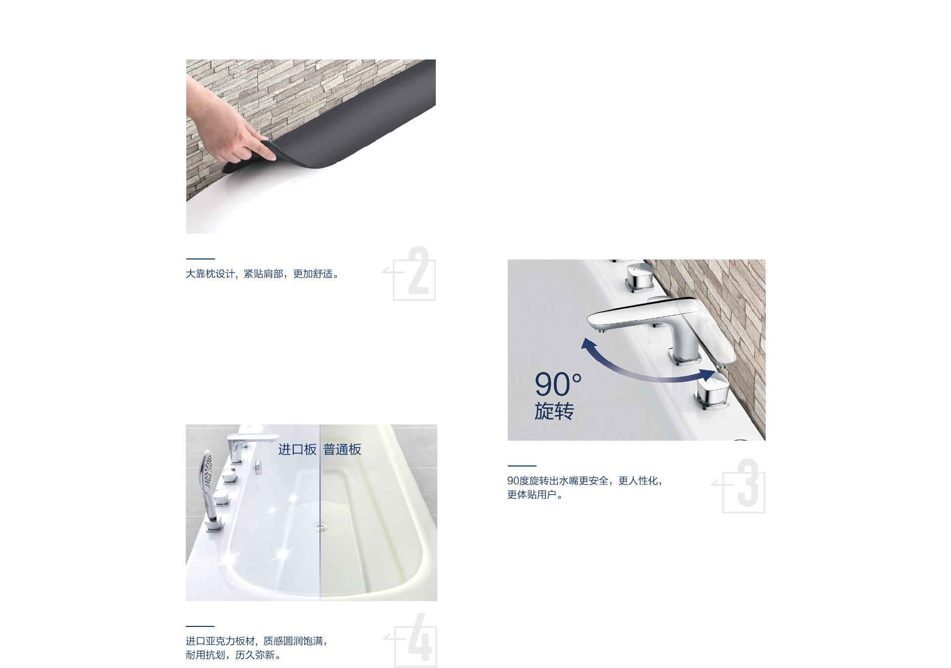 水療獨立按摩系統、勁速沖浪按摩系統、微泡泡按摩系統及汽泡按摩系統三件模式供你選擇,讓你隨心所浴,樂享水悅生活