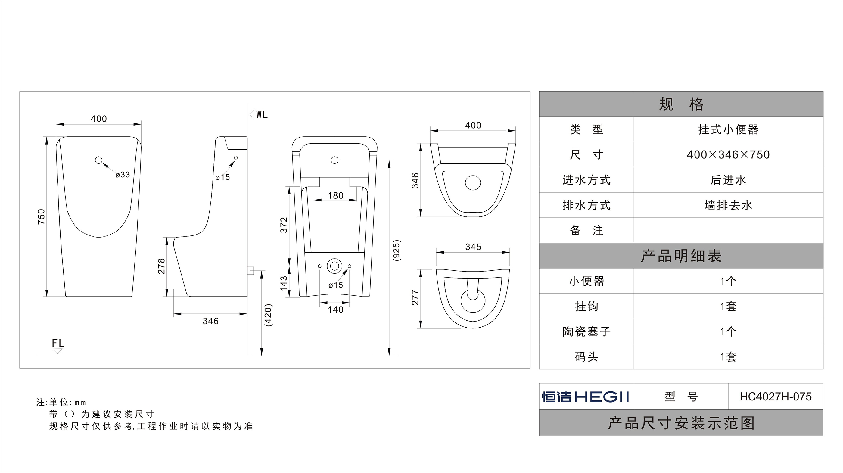 HC4027H-075一體感應(yīng)式掛式小便斗